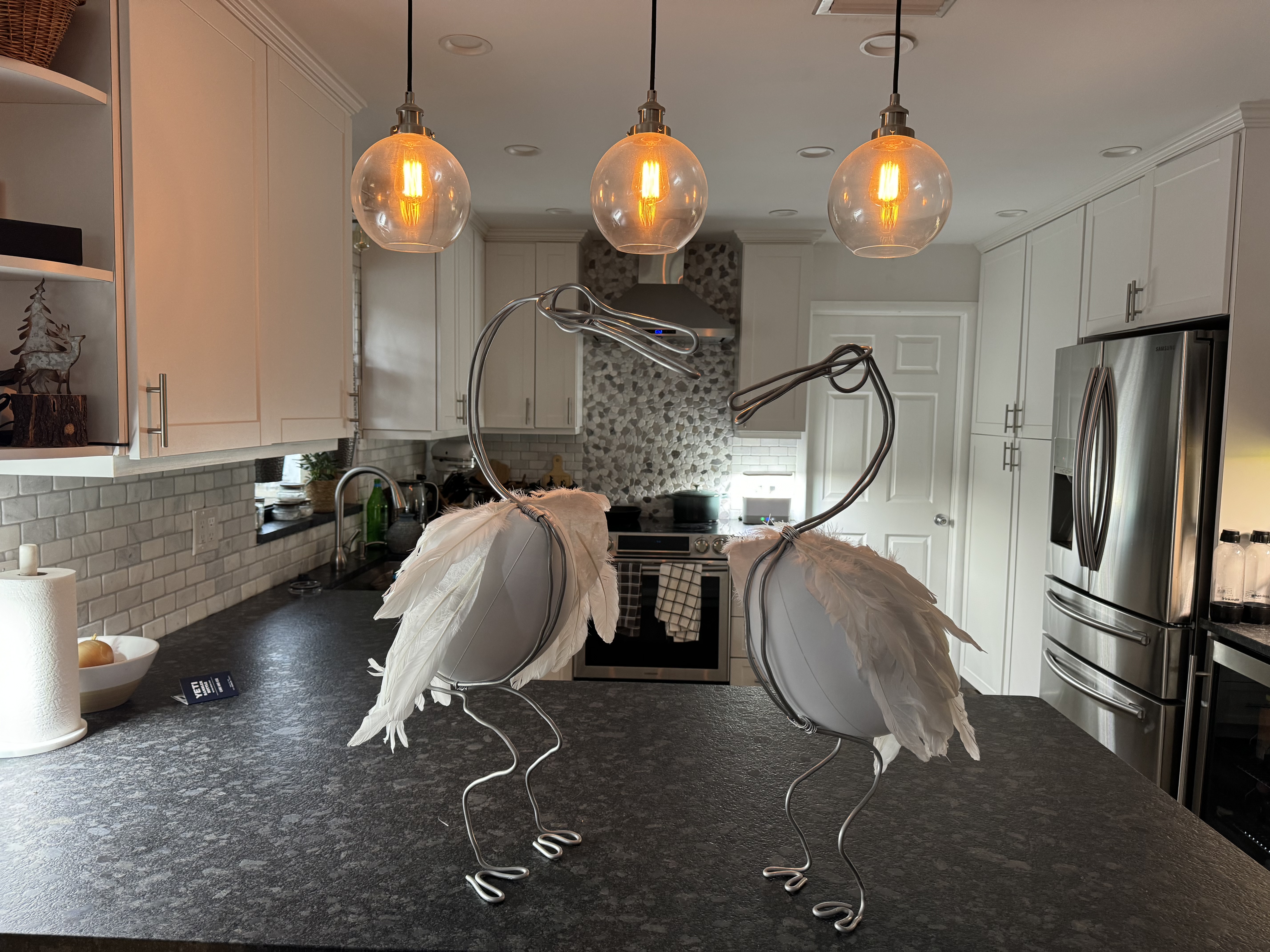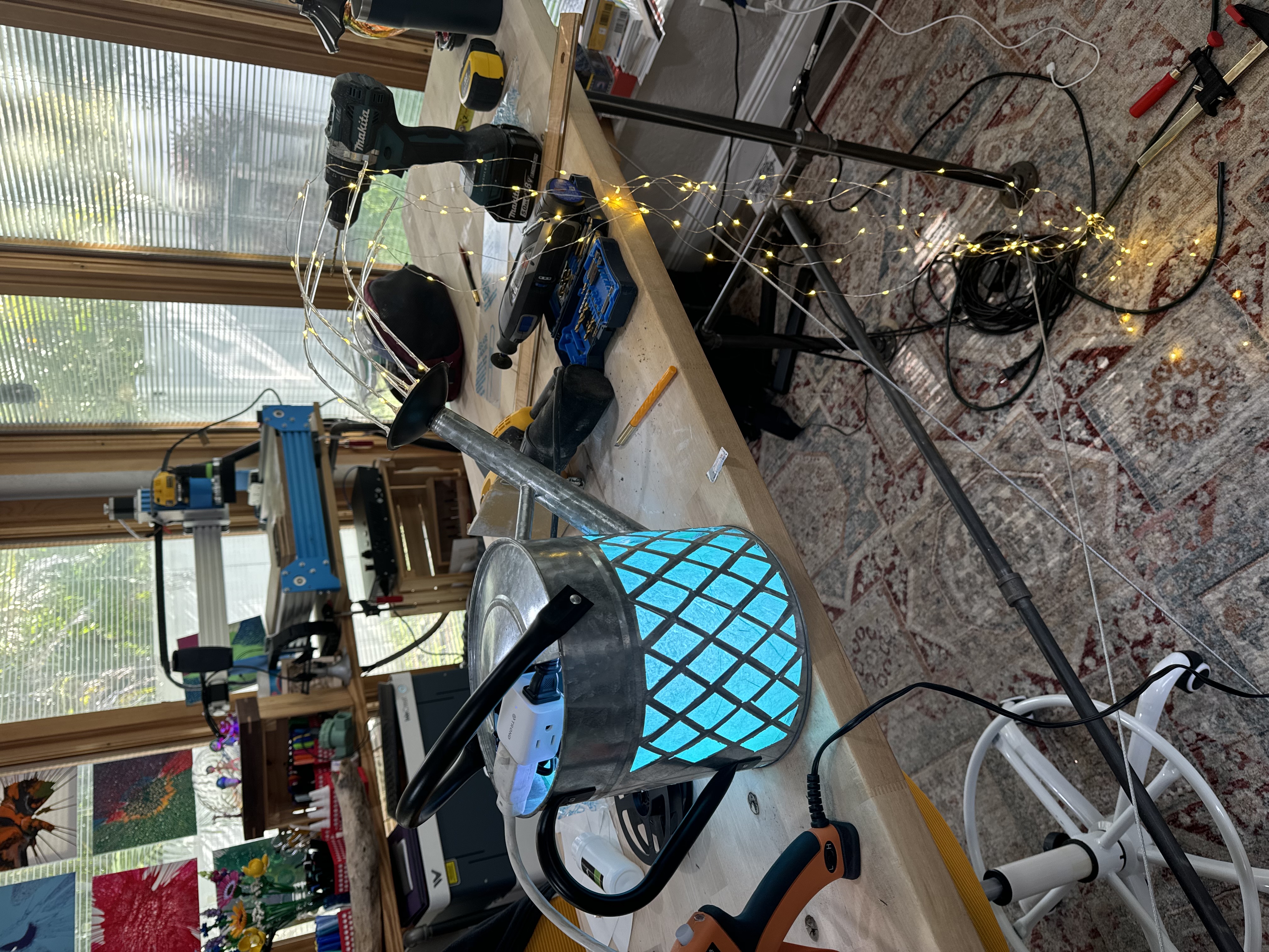 I contributed four pieces to the installation. A set of 3D printed hummingbirds that I and other FPC members painted and embellished — some with glitter, some with bold color. A lighted hummingbird feeder with fairy lights and painted birds perched around it. A pair of ibis built from wire frames with real feather wings. And a galvanized watering can modified with a lattice cutout and internal lighting that gave it a warm glow.